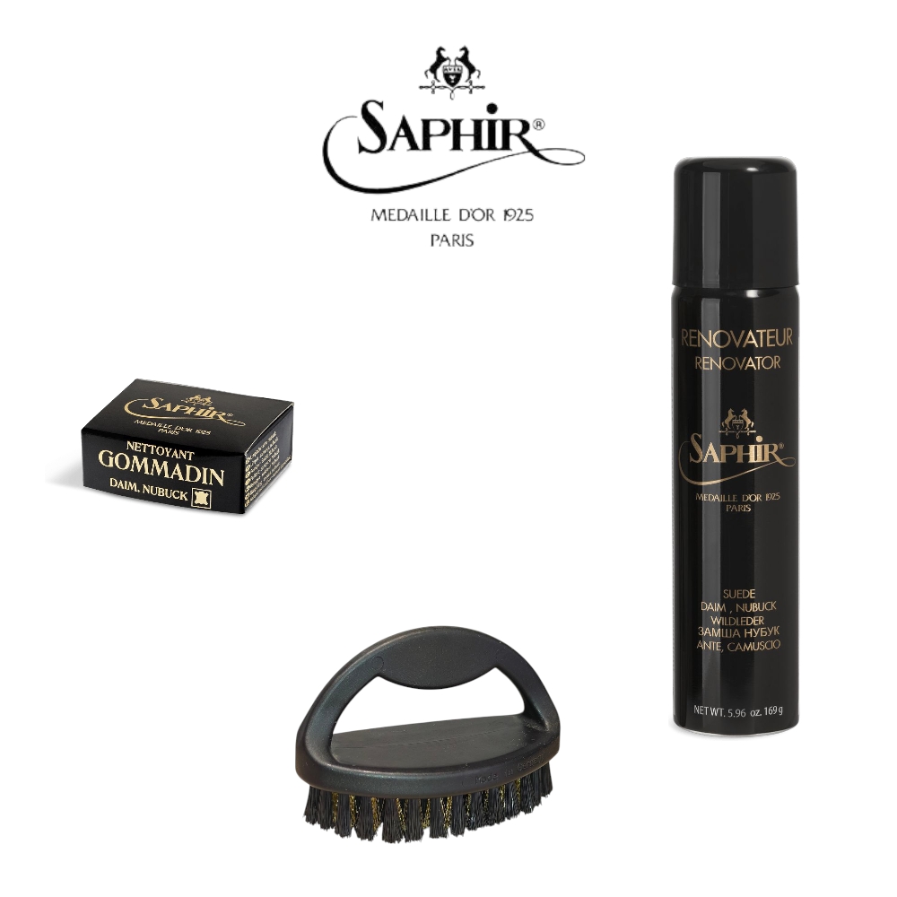 Χρύση σειρά Saphir – πακέτο προϊόντων περιποίησης για καστόρινα και σουέτ υποδήματα.